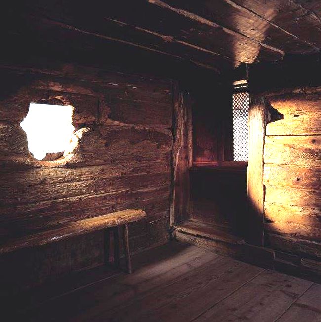 Die ursprüngliche Einsiedelei-Klause des Heiligen Bruder Klaus wie sie auch heute noch ist. Durch das Fenster links hat er Besucher beraten, durch das vergitterte Fenster rechts hatte er direkten Blick in die eigens für ihn errichtete Kapelle. Auf der kleinen Bank hat er geschlafen. Ein Stein diente ihm als Kopfkissen!